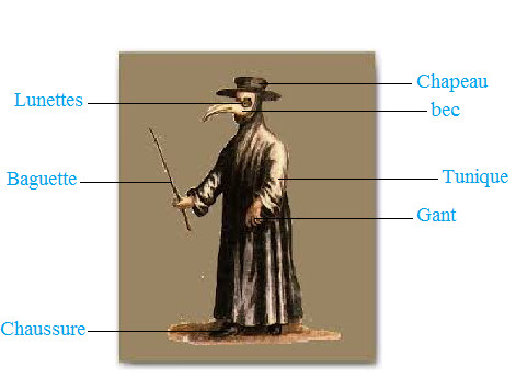 Le costume du médecin de la peste est constitué de 80% de cuir qui est une matière assez efficace contre les piqûres de puces et qui sert de carapace au médecin. Dans certains cas, le cuir du costume est remplacé par une tunique faite de lin. Dans le masque en forme de bec d'oiseau, on incorpore des herbes aromatiques afin de protéger le médecin de l'air putride. Sur le masque, il y a des bésicles (anciennes lunettes rondes). La canne sert à soulever les vêtements des pestiférés.