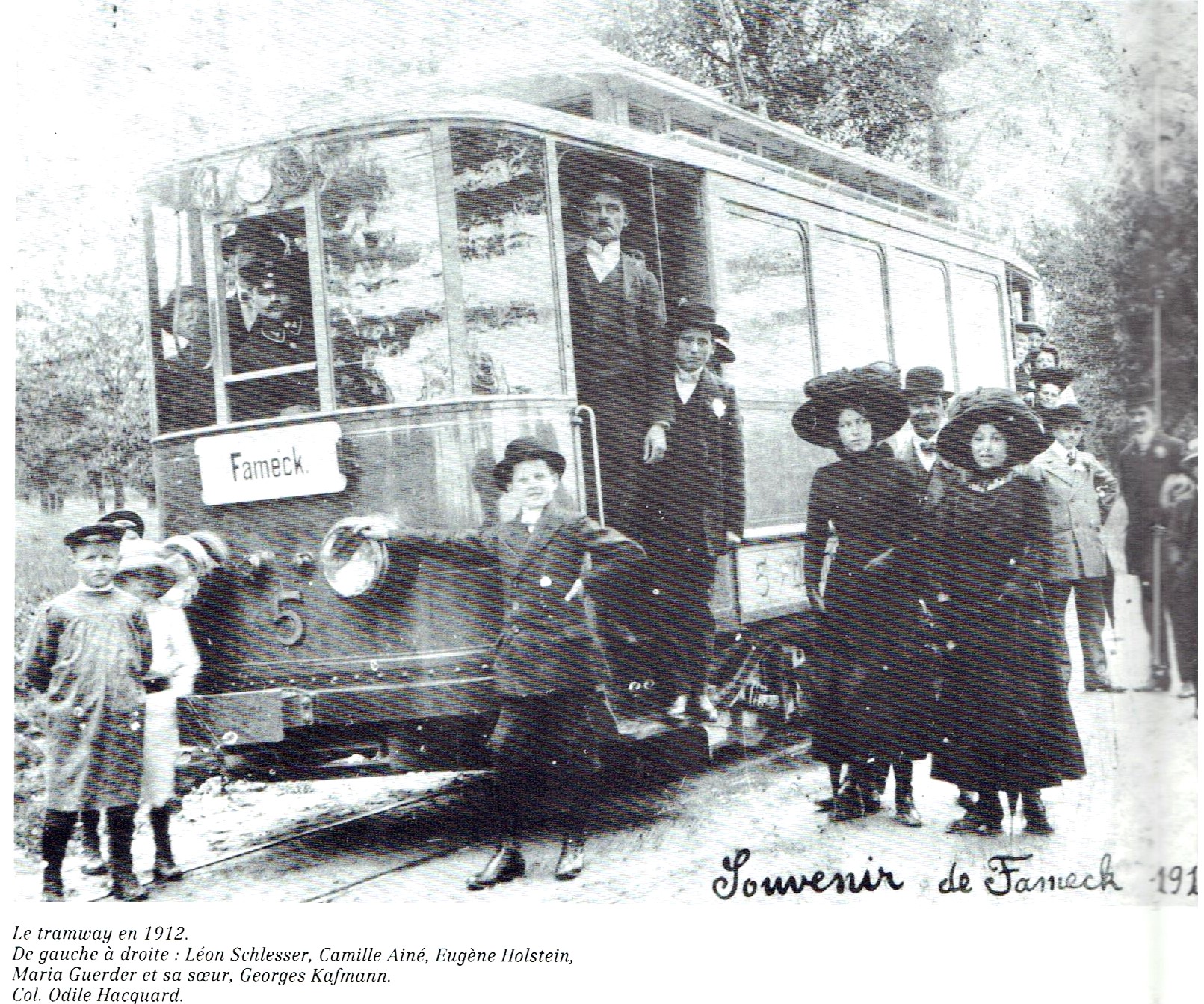Sur la photo, on peut voir la fierté que les habitants de Fameck avaient de voir leur ville desservie par le tramway. Celui-ci avait une vitesse maximale de 16km/heure en ville et 36km/heure en campagne. Dès 1913, plus de 3,5 millions de voyageurs empruntent le réseau et dans les années 30, plus de 140 agents font tourner les 24 motrices disponibles. Les remorques avaient 18 places assises et 16 debout. Deux remorques étaient réservées aux jours de marché ou de manifestation publique quelconque. Le chauffage des remorques fut assuré dès 1913.